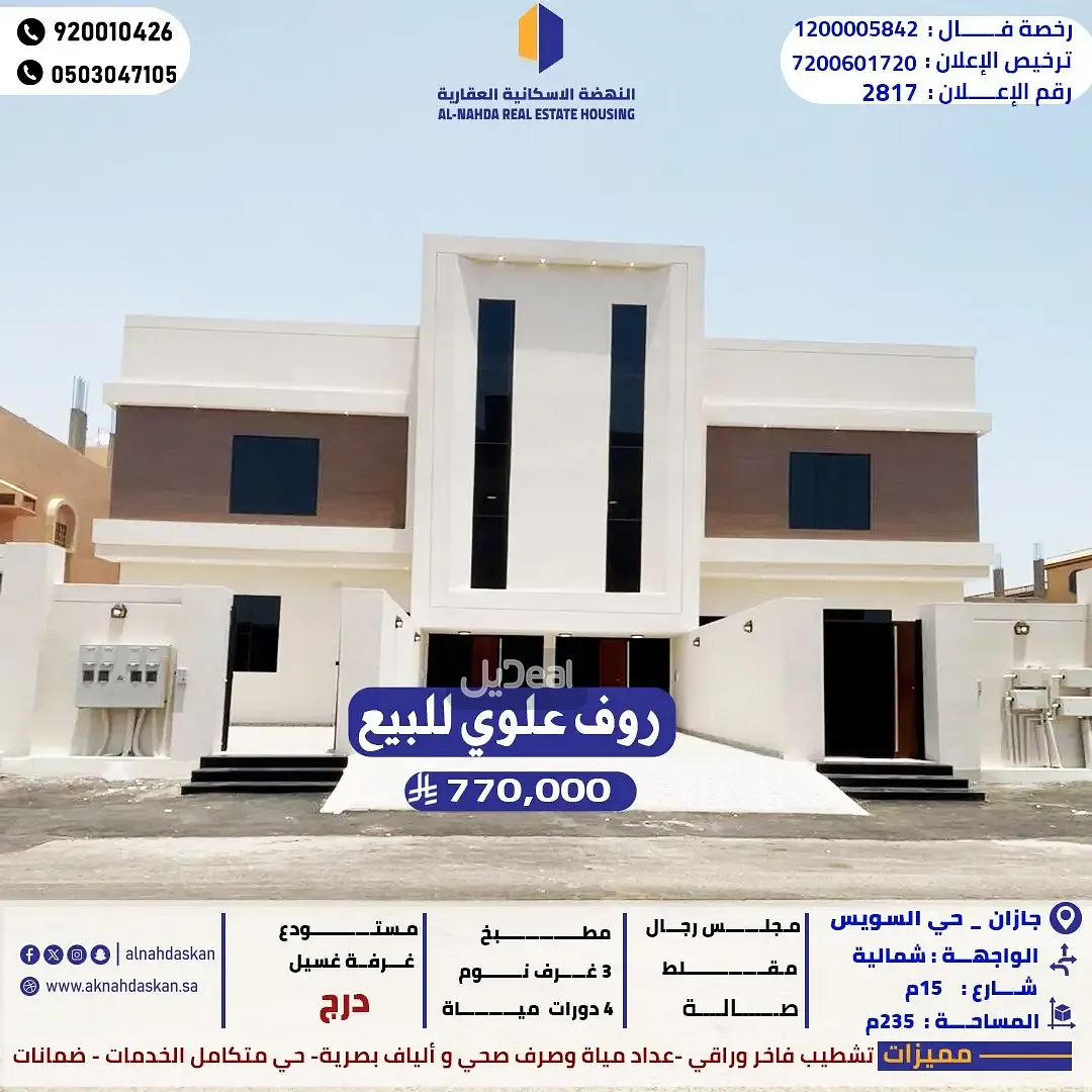 روف علوي للبيع جازان -حي السويس