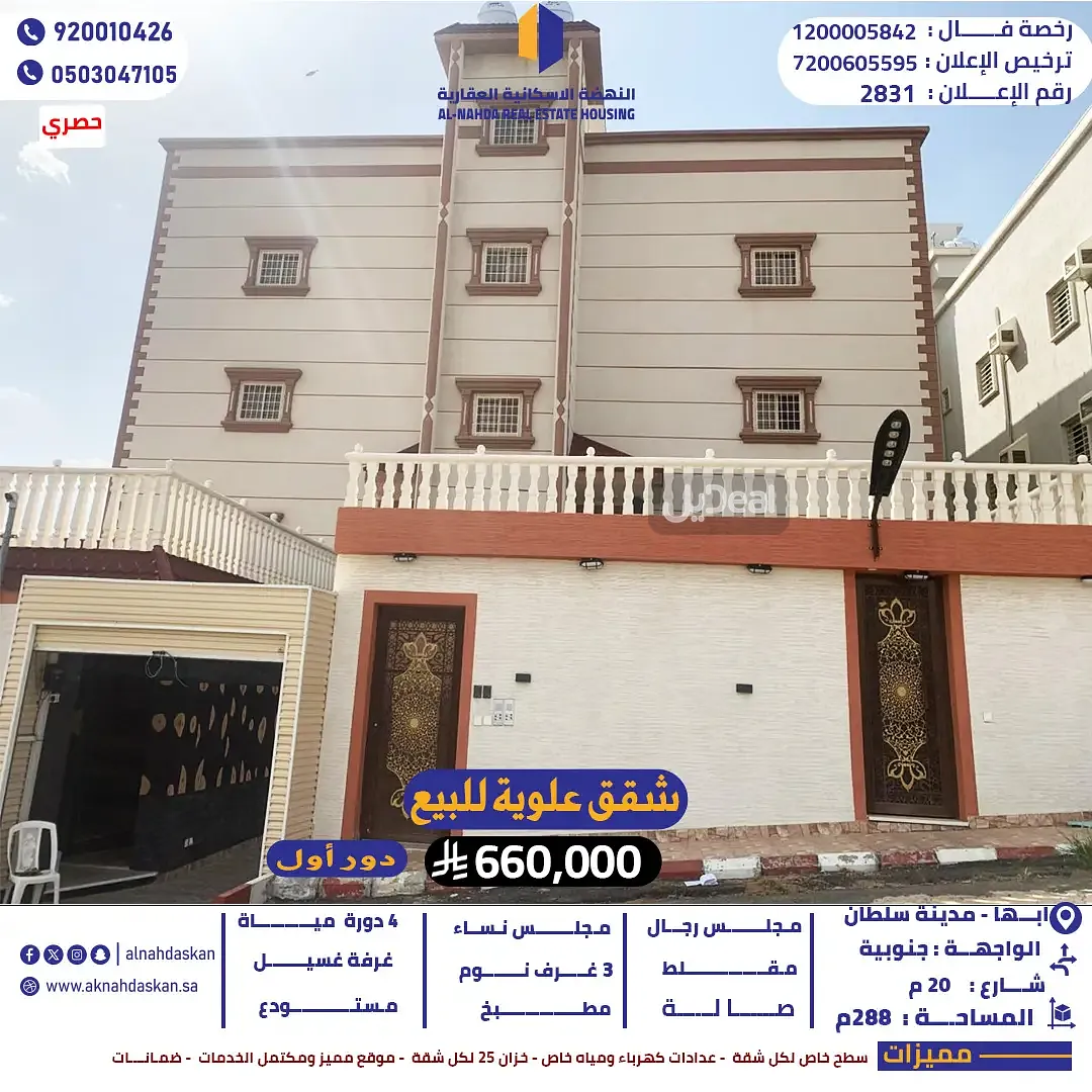 شقق علوية للبيع ابها حي مدينة سلطان _ المحالة
