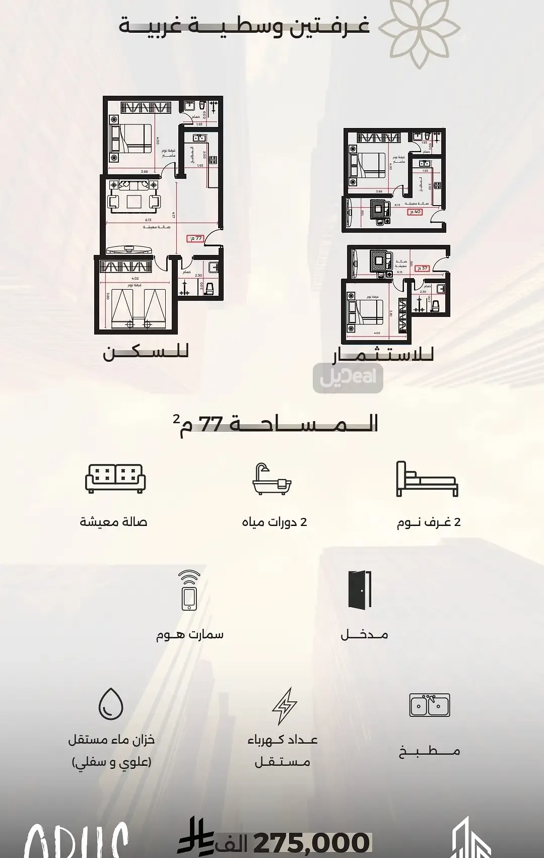 ▪️ شقة 2 غرف (وسطية) – 77م²