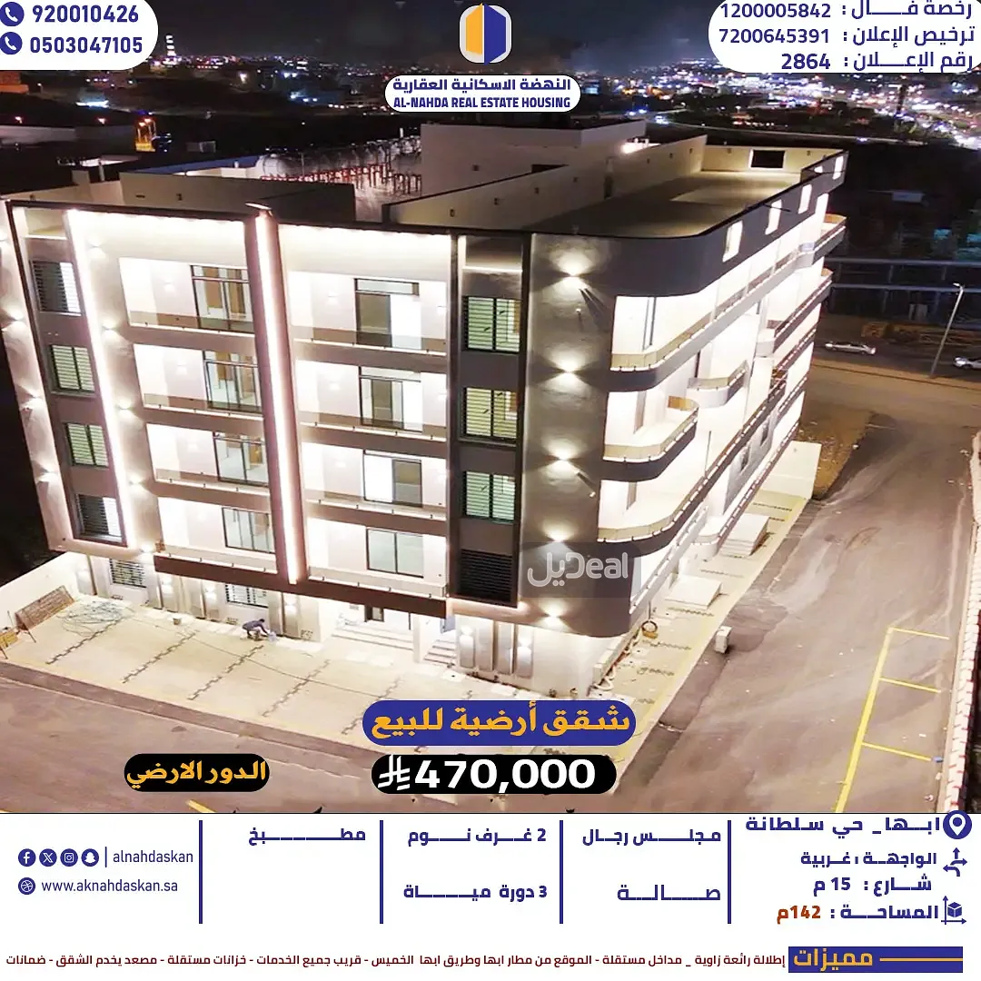 المميزات الضمانات الموقع قريب من مطار ابها ولافاندا بارك وقريبه جدا من طريق ابها الخميس تبعد عنه اقل من ٥٠ متر قريب من الجوامع والخدمات والمدارس والمولات عداد كهرباء مستقل لكل شقة خزان علوي وارضي مستقل لكل شقة شقق فندقيه رائعة بمساحات كبيره مصعدين جاهزه تخدم الشقق وبكبينه واسعة جدا **الضمانات ** ضمان سباكه ٥٠ سنه ضمان كهرباء ٢٥ سنه ضمان على القطع الصحية سنتين الى 5 سنوات ضمان 10 سنوات على الالمنيوم مصعد ايطالي فل كامل وضمان على المصعد سنتين صيانة شاملة قطع الغيار + ضمان على مكينة المصعد 20 سنة