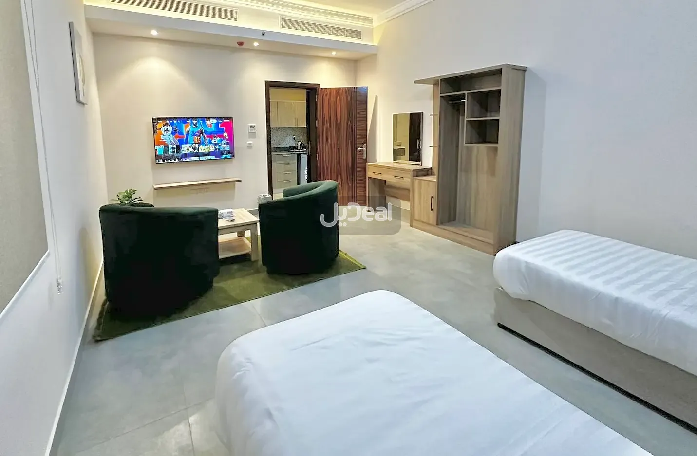 استوديو هادئ بسريرين فردية يحتوي على جلسة جانبية ودورة مياه وركن تحضيري