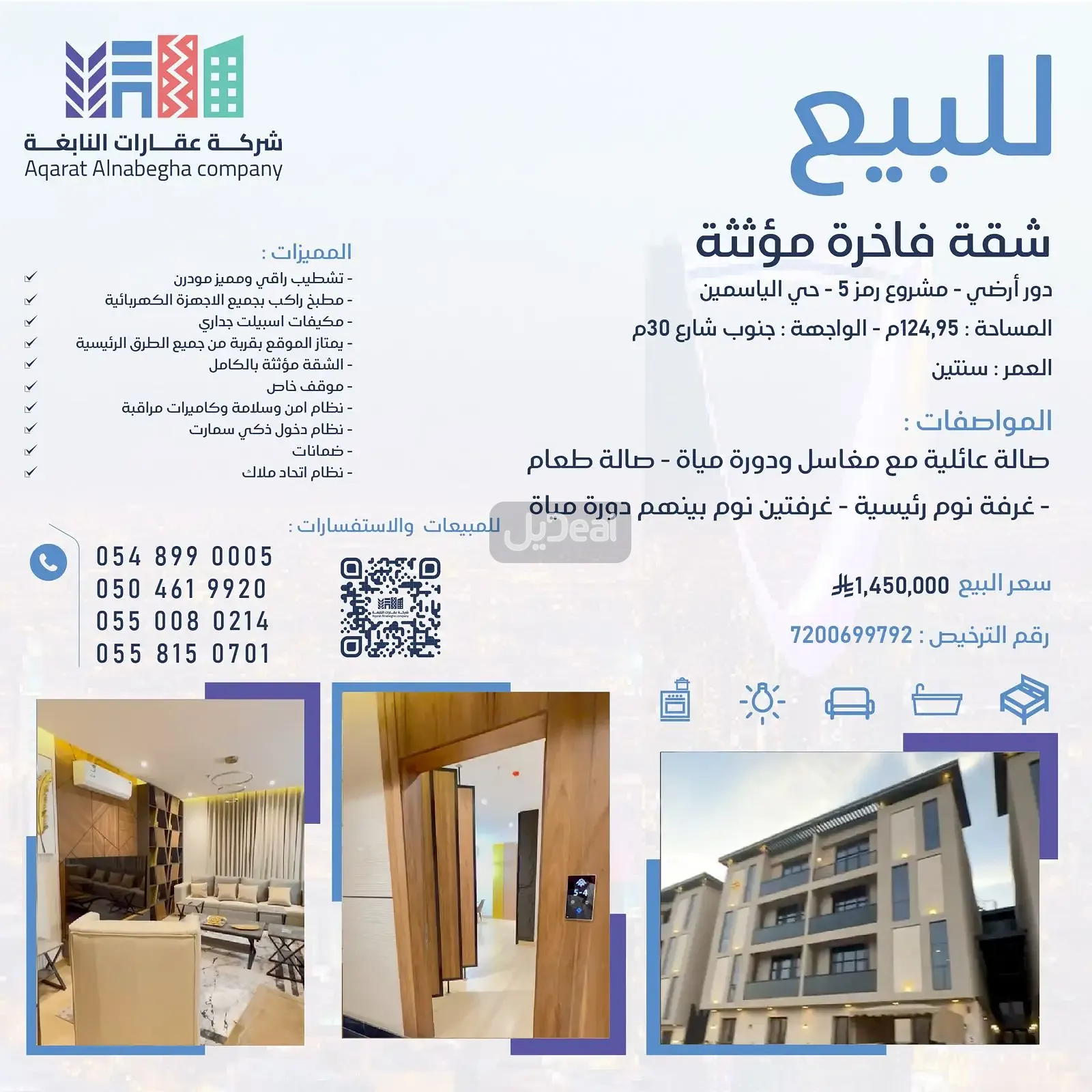للبيع شقة فاخرة مؤثثة دور أرضي مشروع رمز ٥ - حي الياسمين