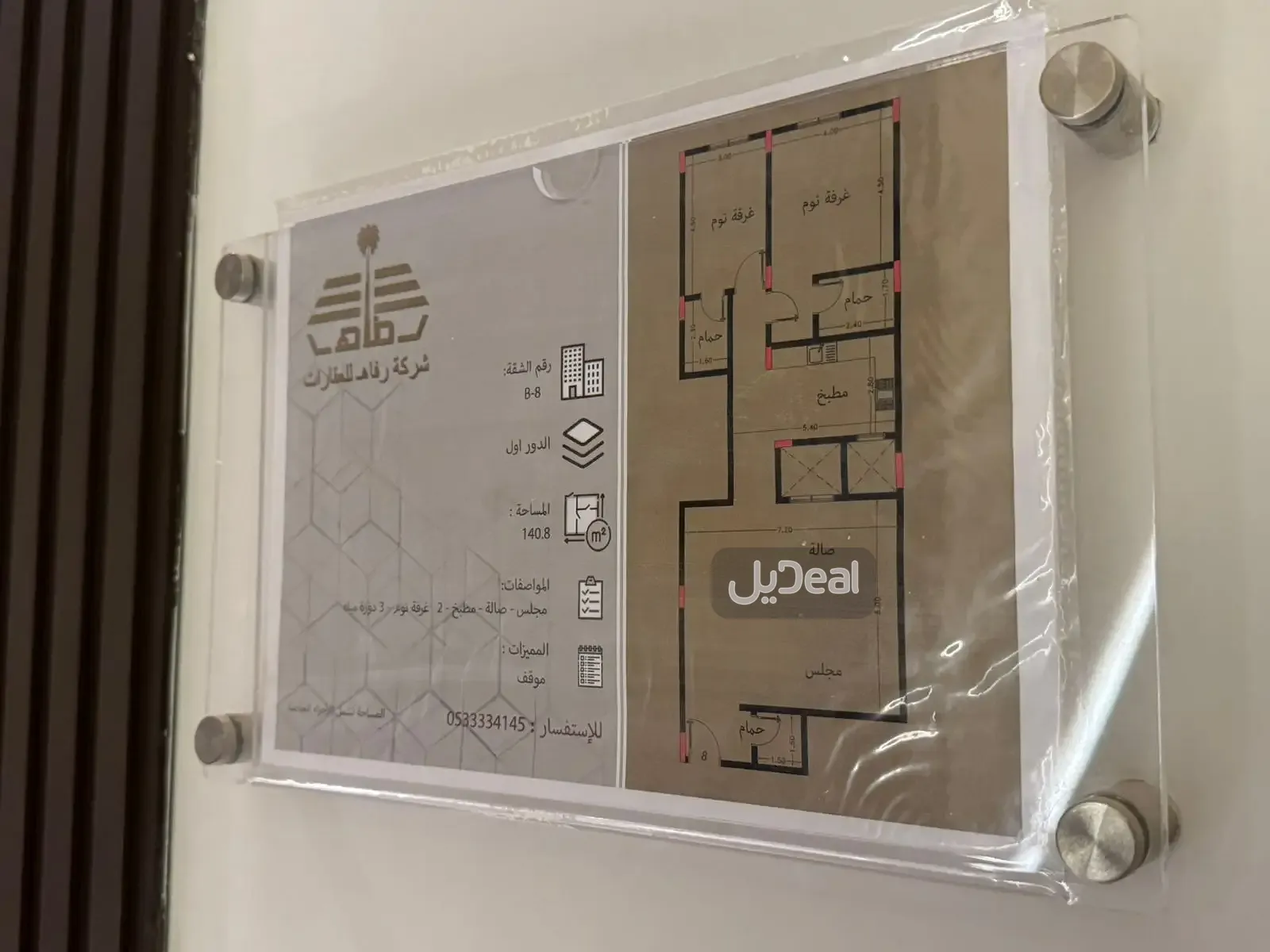 رقم الشقة B8 تتكون من مجلس واسع مطبخ راكب بأجهزة جديدة فرن ثلاجة غسالة صحون غسالة ملابس مايكرويف خزائن جديدة وعالية الجودة غرفتين نوم ماستر، كل غرفة تتكون من دورة مياه خاصة مكيفات سبلت جديدة وراكبة موقف خاص للسيارة عداد كهرباء مستقل نظام دخول ذكي قريب من طريق الملك سلمان، وسعود بن جلوي، وأبو بكر الصديق