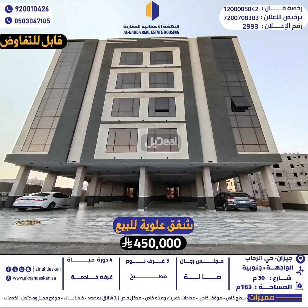مجلس رجال صالة مطبخ 3 غرف نوم 4 دورات مياه غرفة خادمة مواقف سيارة عداد مياه خاص عداد كهرباء خاص قريبه من جميع الخدمات ضمانات متوفرة تبعد عن مطار جيزان 10دقايق تبعد عن هايبر بنده 5 دقايق الواجهة: جنوبية المساحة: 163م الشارع: 30 م السعر: 450,000 رقم الترخيص: 7200708383