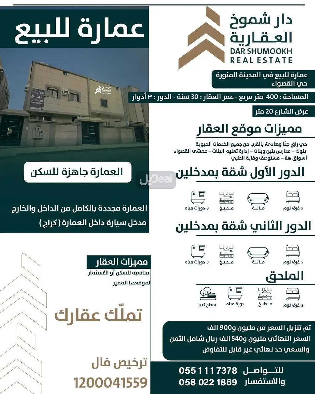 عمارة للبيع في المدينة المنورة –حي القصواء المساحة: 400 م2 عرض الشارع 20 متر