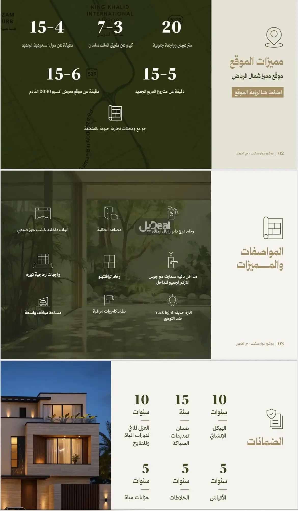 أدوار حي العارض : ١- موقع مميز على شارع بعرض ٢٠ متر واجهة جنوبيه. ٢-المساحات : تبدأ من ٢١٥ متر الى ٢٨٠ متر. ٣- الوحدات : ٣ فلل - عدد الادوار ٩ كل دور عباره عن ٣ غرف نوم ومجلس و صاله كبيره ومطبخ و غرفة خادمة و مستودع وبلكونات لجميع الوحدات و مساحات خارجيه مميزه. ٤- التشطيب : واجهات ومداخل رخام ايطالي. واجهات ونوافذ زجاجيه كبيره مصاعد ايطاليه ومداخل ذكيه. ٥- ضمانات على الاعمال وتشمل الهيكل الانشائي و السباكه و الكهرباء و العزل وتأمين ضد العيوب الخفيه. ٦.السعر : يبدأ السعر من أصغر مساحة 1.395,000 إلى أكبر مساحة 1.875,000 . التواصل مع ممثل الشركة للتفاصيل أو الحجز :0505693420