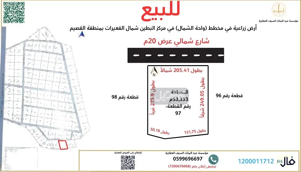 للبيع أرض زراعية في مخطط واحة الشمال في مركز البطين شمال القعيرات بمنطقة القصيم