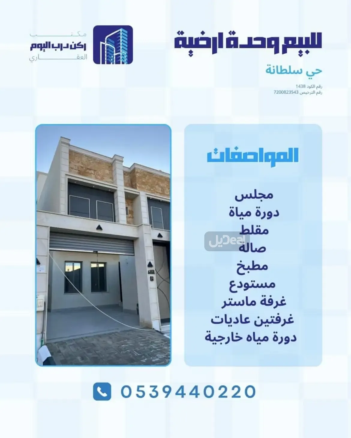 مجلس رجال مع دوره مياه + مقلط + صاله + غرفه نوم ماستر + غرفتين + دوره مياه + مطبخ مستودع