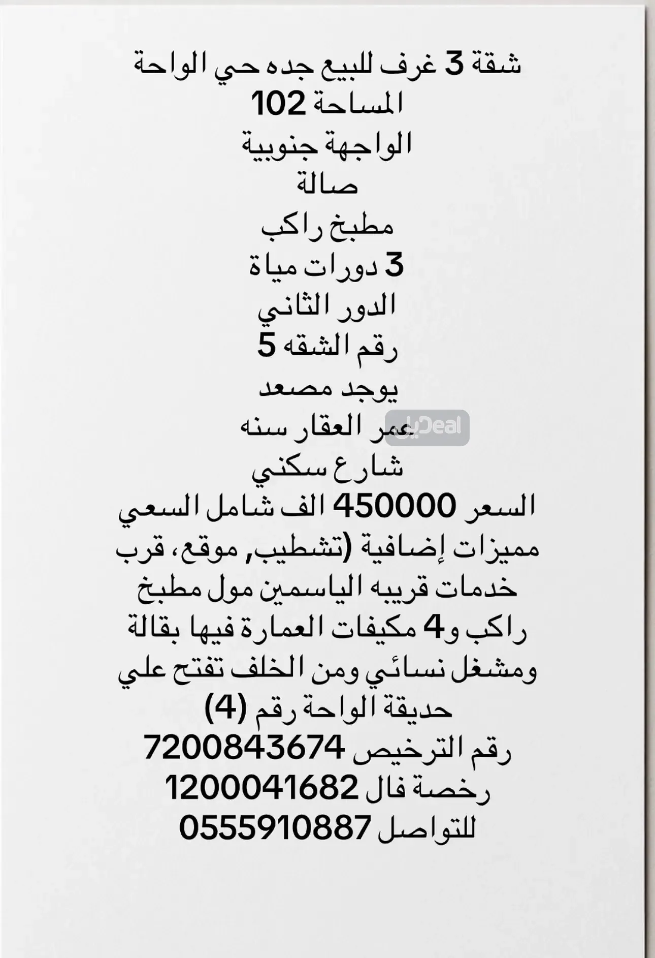 شقة 3 غرف للبيع جده حي الواحة المساحة 102 الواجهة جنوبية صالة مطبخ راكب 3 دورات مياة الدور الثاني رقم الشقه 5 يوجد مصعد عمر العقار سنه شارع سكني السعر 450000 الف شامل السعي مميزات إضافية (تشطيب, موقع، قرب خدمات قريبه الياسمين مول مطبخ راكب و4 مكيفات العمارة فيها بقالة ومشغل نسائي ومن الخلف تفتح علي حديقة الواحة رقم (4) رقم الترخيص 7200843674 رخصة فال 1200041682 للتواصل 0555910887