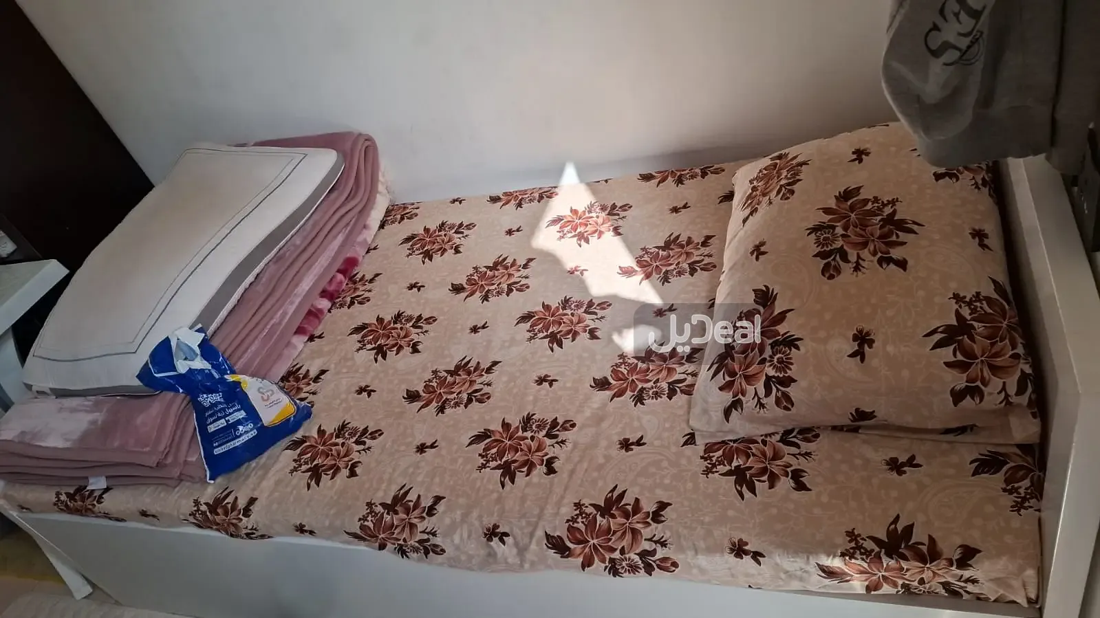 غرفة مؤثثة بالكامل ، مع ثلاجة وسرير ودولاب ملابس