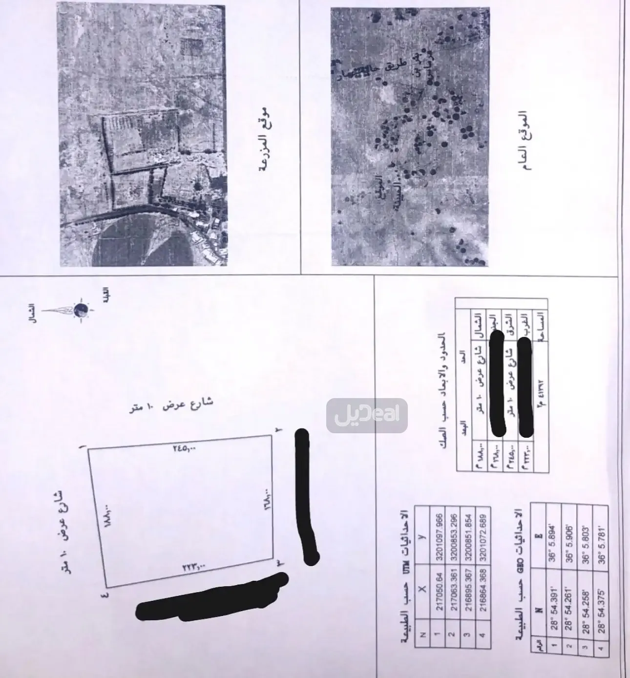 المساحة : 41392 متر مربع (واحد و اربعون الفاً وثلاثمائة واثنان وتسعون ) مترا مربعاً علي شارعين حسب الصك والكروكي المرفق .