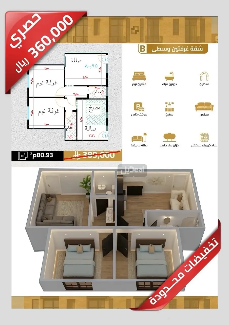 شقة غرفتين نوم – تصميم عملي ومساحة 80.93م²