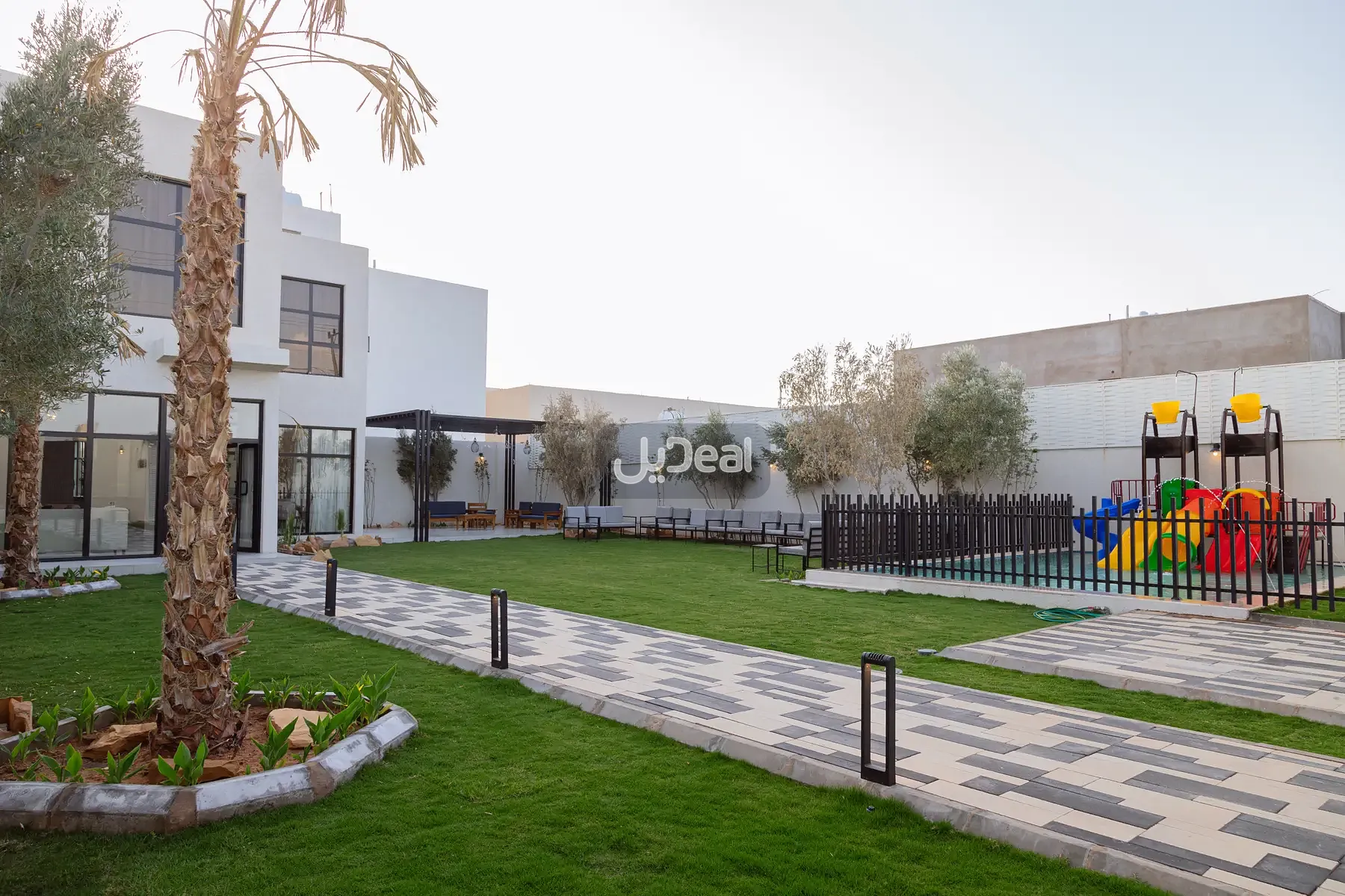 تحتوي على غرفتين نوم ومجلس ومطبخ ومستودع وعدد ٢ دورة مياة مع مسطحات خضراء والعاب مائية للاطفال