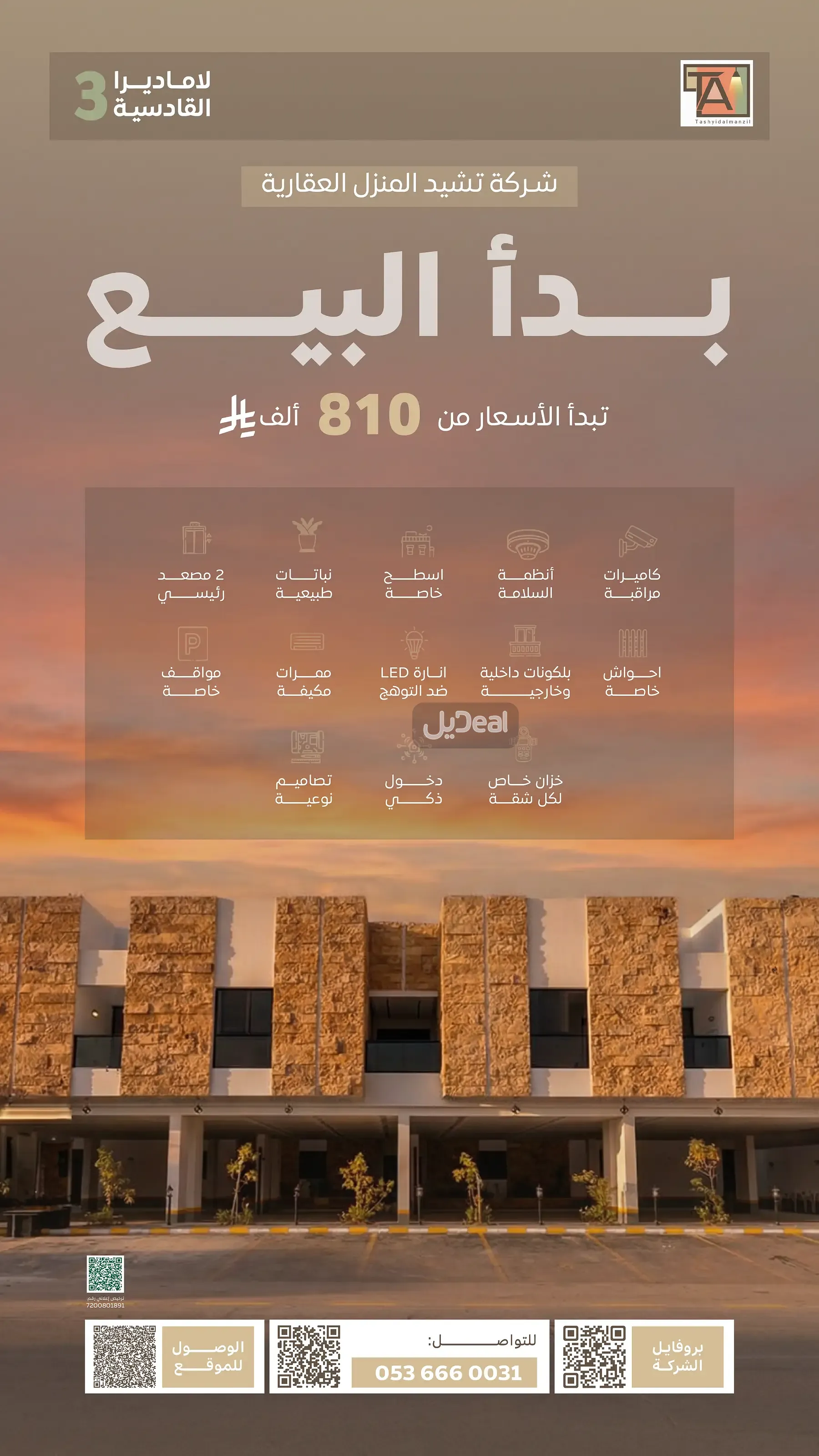 مشروع لاماديرا القادسية٣ عمارة سكنية مكونة من ٢٦ شقة واجهة حجرية ، مطابقة لكود البناء السعودي وتحت إشراف هندسي. مزايا المشروع: - خزان خاص لكل شقة - ٢ مصعد رئيسي - موقف سيارة خاص - احواش خاصة - بلكونة - اسطح خاصة - تصاميم نوعية - دخول ذكي - كاميرات مراقبة - انظمة سلامة - نباتات طبيعية - تصاميم نوعية - انارة LED ضد التوهج - ممرات مكيفة التفاصيل لكل وحدة: 3 غرف نوم (ماستر)، مجلس وصالة، 3 دورات مياه، موقف سيارة خاص لكل شقة. يتوفر خزان خاص لكل شقة , تتوفر وحدات بمدخل خاص ، حوش، بلكونة أو سطح خاص. ضمانات إنشائية وفنية طويلة المدى. الأسعار تبدأ من 810,000 ريال لمزيد من التفاصيل يرجى