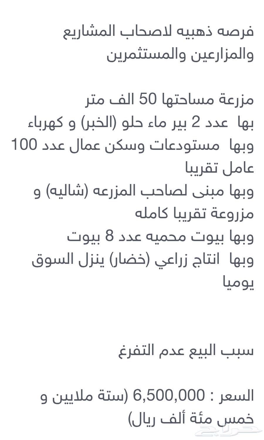 مزرعة مساحتها 50 الف متر بها عدد 2 بير ماء حلو (الخبر) و كهرباء وبها مستودعات وسكن عمال عدد 100 عامل تقريبا وبها مبنى لصاحب المزرعه (شاليه) و مزروعة تقريبا كامله وبها بيوت محميه عدد 8 بيوت وبها انتاج زراعي (خضار) ينزل السوق يوميا