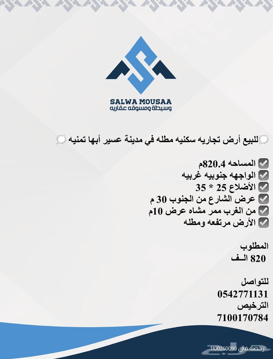 🗯️للبيع أرض تجاريه سكنيه مطله في مدينة عسير أبها تمنيه 🗯️ ️ المساحه 820.4م ️ الواجهه جنوبيه غربيه ️ الأضلاع 25 * 35 ️ عرض الشارع من الجنوب 30 م ️ من الغرب ممر مشاه عرض 10م ️ الأرض مرتفعه ومطله