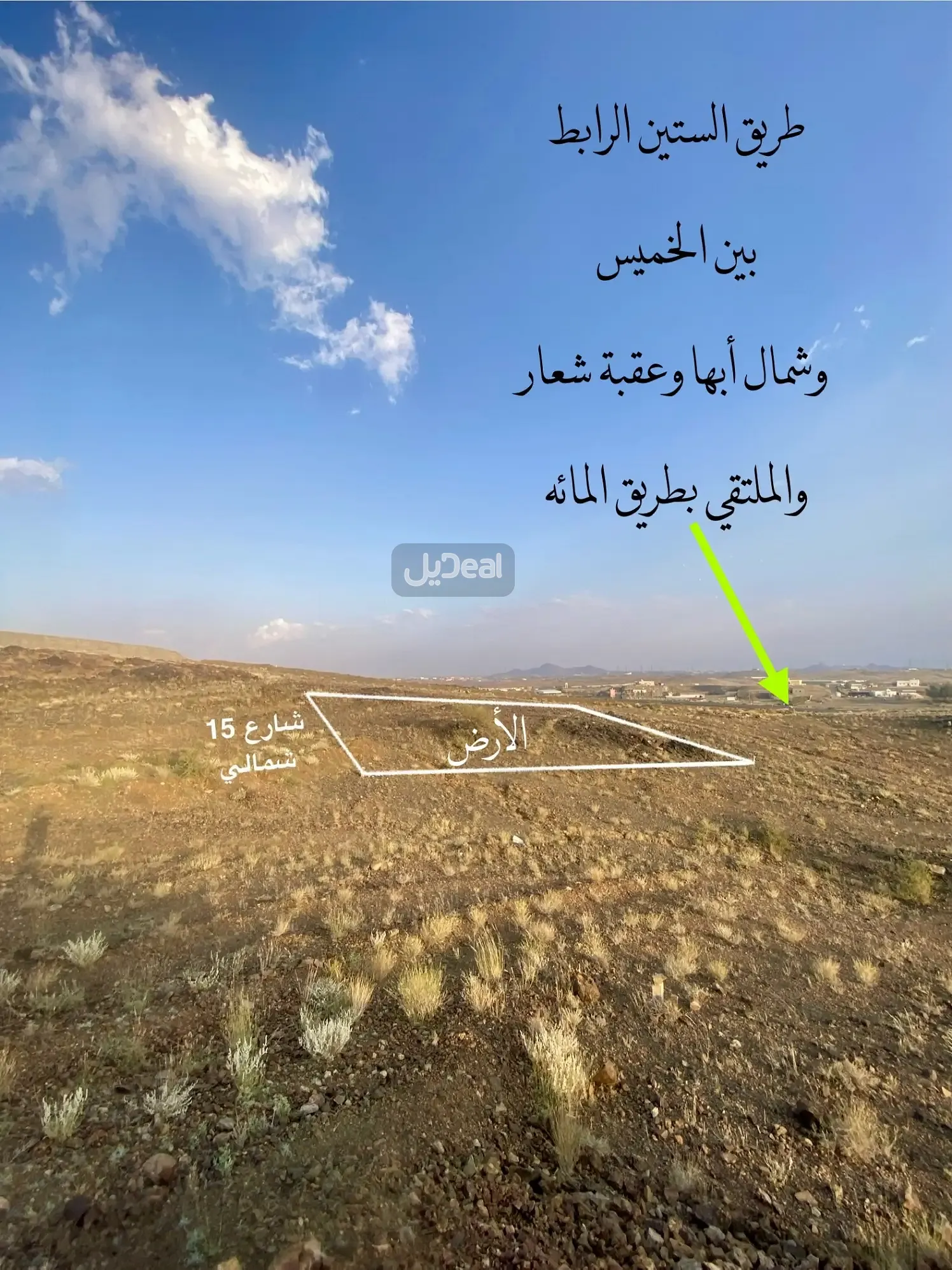 أرض للبيع مخطط الاعيلب التابع للخميس القريب من العماره قريبه جداً من الطريق الجديد الرابط الخميس - عقبة شعار بموقع مميز ومطل ولايوجد امام الارض اراضي اخرى وطبيعتها عزاز بميول معقول