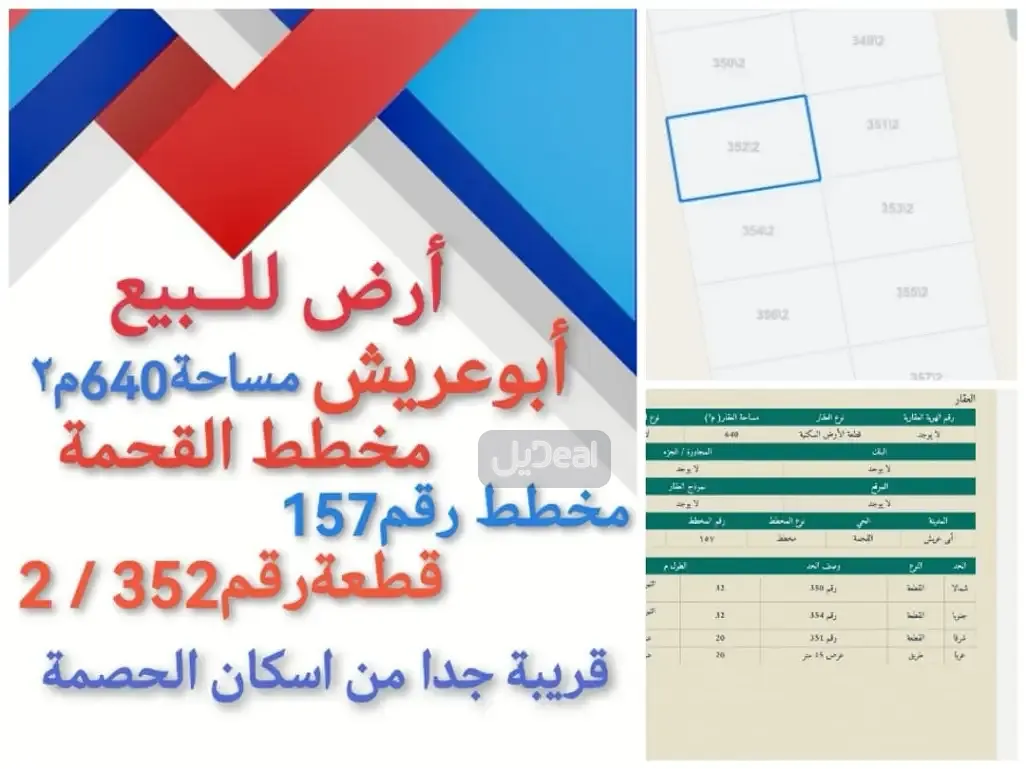 للبيع ارض في ابوعريش مخطط القحمة مساحه 640 متر شارع 15م٢ واجهة غربية قطعه رقم 2/ 352 محطط رقم 157 المطلوب 1600000 شامل مع سعي وضريبه عقد وساطه رقم 7100182151