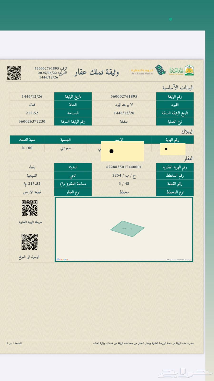 🚩قطعة 1/48 المساحة 217م شارع عرض 12م شارع عرض 20م .. 🚩قطعة 2/48 المساحة 214م شارع 20م .. 🚩قطعة 3/48 المساحة 215م شارع 20م .. 🚩قطعة 4/48 المساحة 214م شارع 12م شارع 20م الحد للقطعة شارع (27500 صافي ) الحد للقطعة شارعين ( 30000 صافي ) إفراغ فوري عن طريق البورصة العقارية —————————————————— السيادة للعقارات متخصصون في الوساطة و التسويق العقاري نستقبل عروضكم ونوفر طلباتكم مرخصون من ًالهيئة العامة للعقار برقم: 1100281643 ( أبو سالم ) 📌للتواصل / ( رقم الجوال يظهر عند الضغط على زر تواصل ) ----- نأمل مطابقة الموقع على الخريطة مع الموقع حسب الصك الضمانات و مدتها: لايوجد