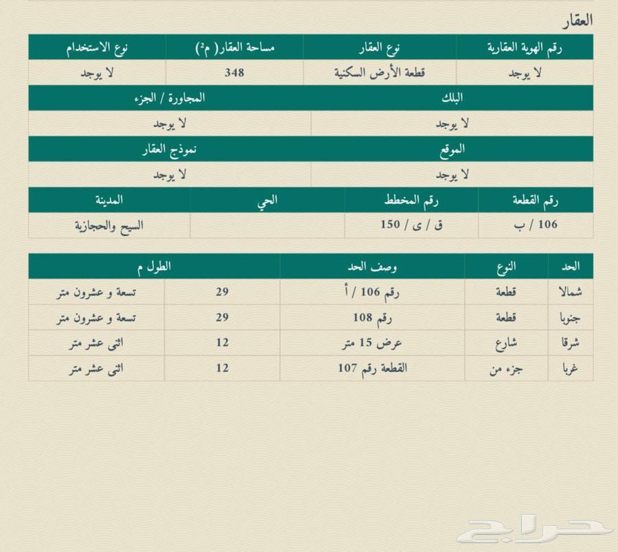 🔷رقم القطعة : 106/ب 🔷مخطط رقم : ق/ي/150 🔷المساحة : 348 🔷شارعها : شرقي 15 🔷السعر : 39 ألف ﷼ صافي للمالك ◾️ صك الكتروني مستقل ◾️الجوال : ( رقم الجوال يظهر عند الضغط على زر تواصل ) 🔶 رخصة الوساطة : 1100018288