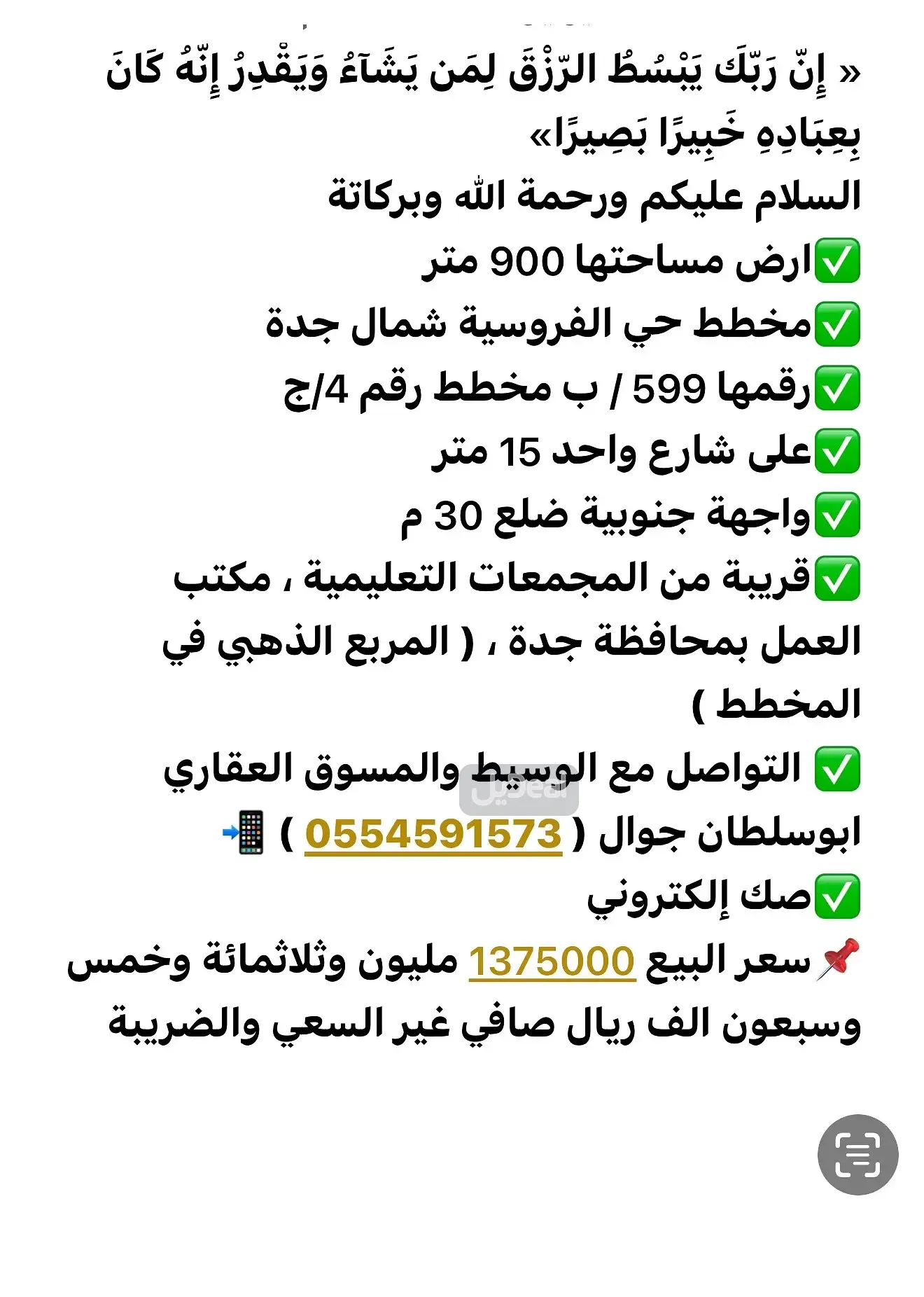 ( إن الله هو الرزاق ذو القوة المتين ) ارض سكنية للليع بجدة حي الفروسية ب 📌رقم القطعة 599 مخطط رقم 4 / ج / س 📌المساحة 900 م شارع 15 جنوبي 📌 الضلع على الشارع 30 م عمق 30 م 📌قريبة من مكتب العمل والمجمعات التعليمية في المخطط 📌سعر البيع مليون وثلاثمائة وخمس وسبعون الف صافي غير السعي وضريبة التصرفات العقارية ✅ الوسيط والمسوق العقاري ابوسلطان 📲0.5.5.4.59.1.5.7.3.