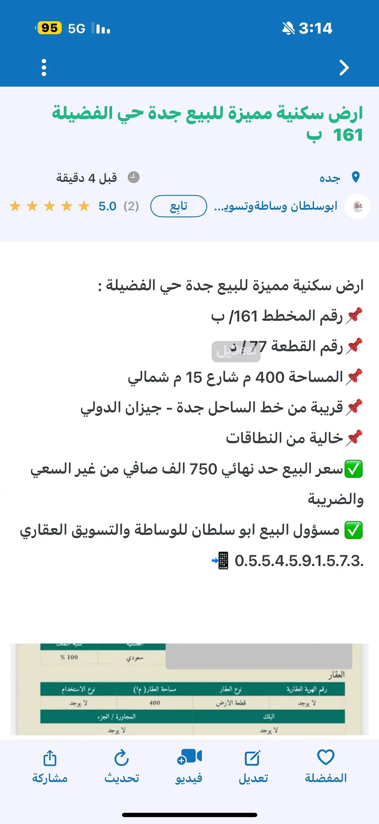 ارض سكنية مميزة للبيع جدة حي الفضيلة : 📌رقم المخطط 161/ ب 📌رقم القطعة 77 / د 📌المساحة 400 م شارع 15 م شمالي 📌قريبة من خط الساحل جدة - جيزان الدولي 📌خالية من النطاقات ✅سعر البيع حد نهائي 750 الف صافي من غير السعي والضريبة ✅ مسؤول البيع ابو سلطان للوساطة والتسويق العقاري 📲 0.5.5.4.5.9.1.5.7.3.