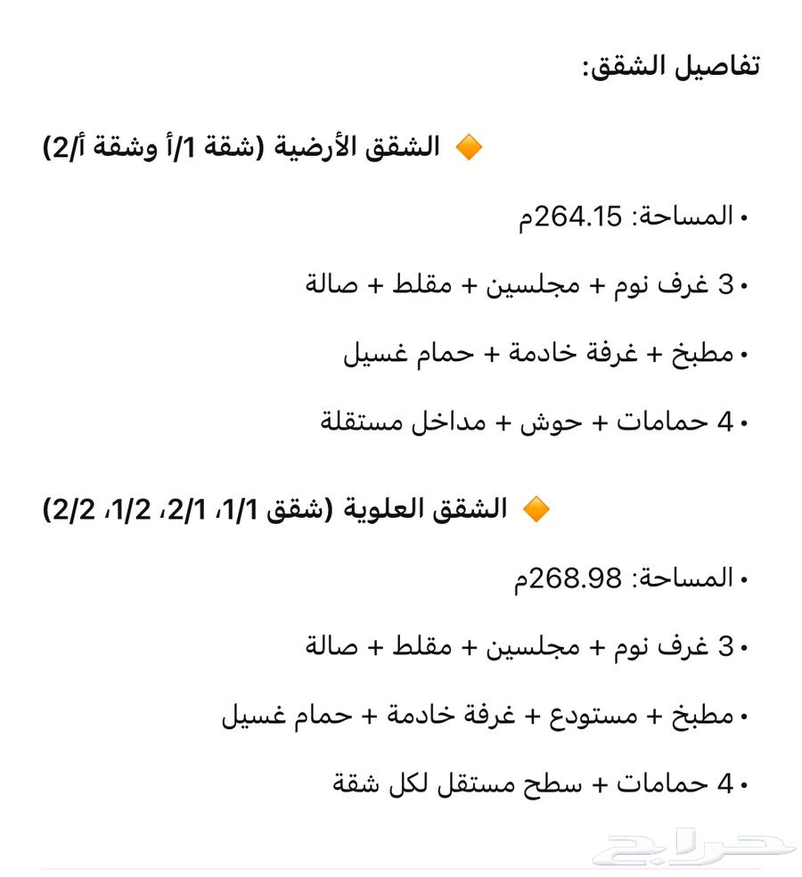 🔸 الشقق العلوية (شقق 1/1، 2/1، 1/2، 2/2) • المساحة: 268.98م • 3 غرف نوم + مجلسين + مقلط + صالة • مطبخ + مستودع + غرفة خادمة + حمام غسيل • 4 حمامات + سطح مستقل لكل شقة للتواصل ( رقم الجوال يظهر عند الضغط على زر تواصل ) ⸻ ----- نأمل مطابقة الموقع على الخريطة مع الموقع حسب الصك الضمانات و مدتها: لايوجد