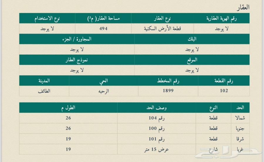 فرصة ذهبية أرض للبيع حي الرحبة في الطائف طريق السيل مساحة 494 رقم القطعة : 102 رقم المخطط : 1899 السوم : 400 الف والبيع قريب .