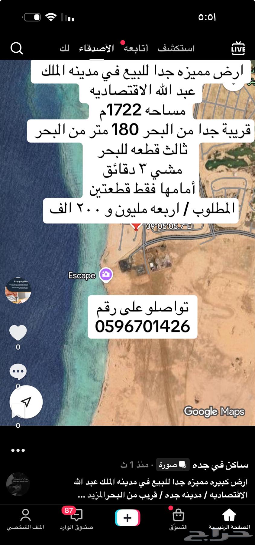 ارض مميزه جدا للبيع في مدينه الملك عبد الله الاقتصاديه مساحه 1722 م قريبه جدا من البحر من البحر 180 م ثالث قطعه للبحر ومشي 3 دقائق فقط امامها للبحر قطعتين المطلوب / 4 مليون و 200 الف