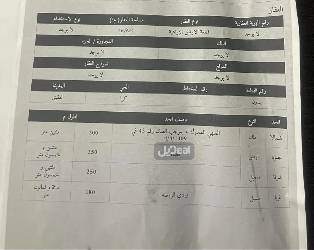 🟠 الأرض زراعية يوجد بها بئر إرتواز وعداد كهرباء وغرف، وعليها (صك شرعي الإلكتروني )
