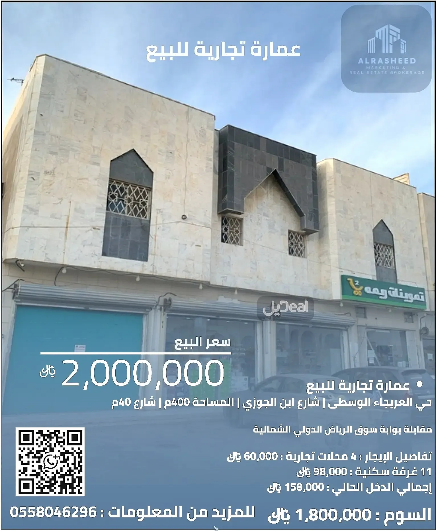 عمارة للبيع حي العريجاء شارع ابن الجوزي المساحة 400م شارع 40م واجهة جنوبية . مقابلة بوابة سوق الرياض الدولي الشمالية العمارة عبار عن 4 محلات تجارية و 11 غرفة سكنية . الدوري الارضي 4 محلات مؤجرة على سوبر ماركت وخلفها غرفتين . الدور الأول 5 غرف والعلوي 4 غرف إجمالي الدخل الحالي : 158 ألف الغرف 11 ايجارها : 98 ألف المحلات 4 ايجارها : 60 ألف السوم مليون و 800 . المطلوب 2 مليون صافي مع المالك ……………………………………………………………