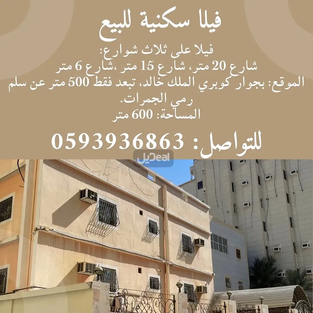 للبيع فيلا مميزة في العزيزية الشرقية – مكة المكرمة موقع استثنائي على ثلاث شوارع: شارع 20 متر، وشارع 15 متر، وشارع 6 متر بجوار كبري الملك خالد وتبعد فقط 500 متر عن سلم رمي الجمرات المساحة: 599.46 متر المسموح في المنطقة: بناء حتى 8 أدوار العمر: 25 سنة تفاصيل الفيلا: • الدور الأول: 5 غرف + 3 دورات مياه + مطبخ • الدور الثاني: نفس توزيع الدور الأول • الملحق: غرفتان + دورة مياه • الحوش: غرفة خارجية بدورة مياه + موقف يتسع لأربع سيارات السعر المطلوب: 6,000,000 ريال الموقع مناسب للسكن أو للاستثمار مثل فندق أو شقق مفروشة للتواصل ومعاينة الموقع: ( رقم الجوال يظهر عند الضغط على زر تواصل ) تاريخ انتهاء رخصة الإعلان : 2025-12-25