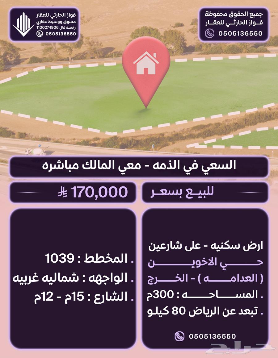 ارض سكنيه - على شارعين حي الاخوين ( العدامه ) - الخرج - المساحه : 300م - تبعد عن الرياض 80 كيلو - - المخطط : 1039 - الواجهه : شماليه غربيه - الشارع : 15م - 12م - 🔺*البيع* : 170 ألف واتساب واتصال ( رقم الجوال يظهر عند الضغط على زر تواصل ) - ----- نأمل مطابقة الموقع على الخريطة مع الموقع حسب الصك الضمانات و مدتها: لايوجد