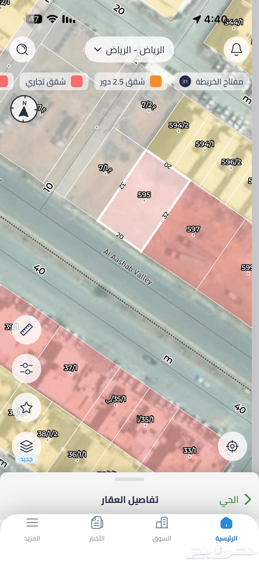 للبيع . أرض سكني تجاري مساحة 640 متر واجهة جنوبية شارع عرض 40 متر الاطوال : 20 على الشارع 32 العمق . رقم القطعة : 595 رقم المخطط : 2584 . البيع : 1,650,000 . لتسويق عقاراتكم والبحث عن طلباتكم وسيط ومسوق عقاري معتمد من الهيئة العامة للعقار ✅ . ----- نأمل مطابقة الموقع على الخريطة مع الموقع حسب الصك الضمانات و مدتها: لايوجد