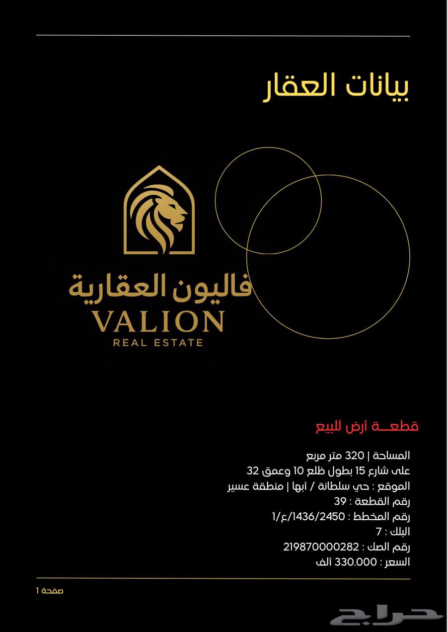 نصف ارض للبيع المساحة 320 متر مربع على شارع 15 بطول ضلع 10 وعمق 32 الموقع : حي سلطانة / أبها | منطقة عسير رقم القطعة : 39 رقم المخطط : 1436/2450/ع/1 البلك : 7 السعر : 330.000 ألف صافي وصف الأرض : • على الطريق الرابط بين حرس الحدود وباحص . - يبعد عنها الطريق المحوري الي تحت التنفيذ " الرابط بين المحالة وطريق الملك عبدالله " 150 متر قريبة من المستشفى السعودي الالماني قريبة من الواحة سنتر قريبة من طريق ابها الخميس