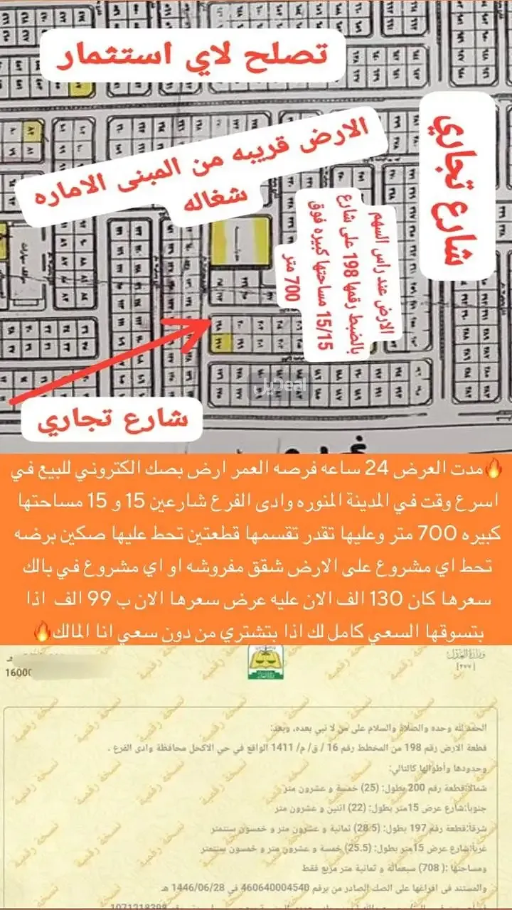 مدت العرض 24 ساعه فرصه العمر ارض بصك الكتروني للبيع كاش او بنك او بمهله في المدينه المنوره وادي الفرع شارعين 15 و 15 مساحتها كبيره 708 متر تقدر تقسمها قطعتين تحط عليها صكين مستويه محددها تصلح اي مشروع معاك أو تاجرها او تخليه تحصل بعد فتره مكسب تبيعها دبل القيمه سعرها كان ب 130 الان عليه عرض 99 الف اذا بتشتري من دون سعي اذا بتسوقها السعي كامل لك انا المالك رقم رخصه الفال 1100028907 رقم رخصه الإعلان 7100234133 رقم الجوال تواصل 0508120238 رقم الجوال تواصل 0508120199 لا تتردد في الاتصال او واتس 24 ساعه مفتوح سبب البيع ظروف خاصه ارض بصك الكتروني