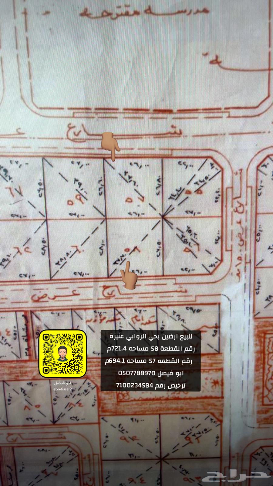 للبيع ارضين بحي الروابي عنيزة رقم القطعة 58 مساحه 721،4م رقم القطعه 57 مساحه 694،1م ابو فيصل ( رقم الجوال يظهر عند الضغط على زر تواصل ) ----- نأمل مطابقة الموقع على الخريطة مع الموقع حسب الصك الضمانات و مدتها: لايوجد