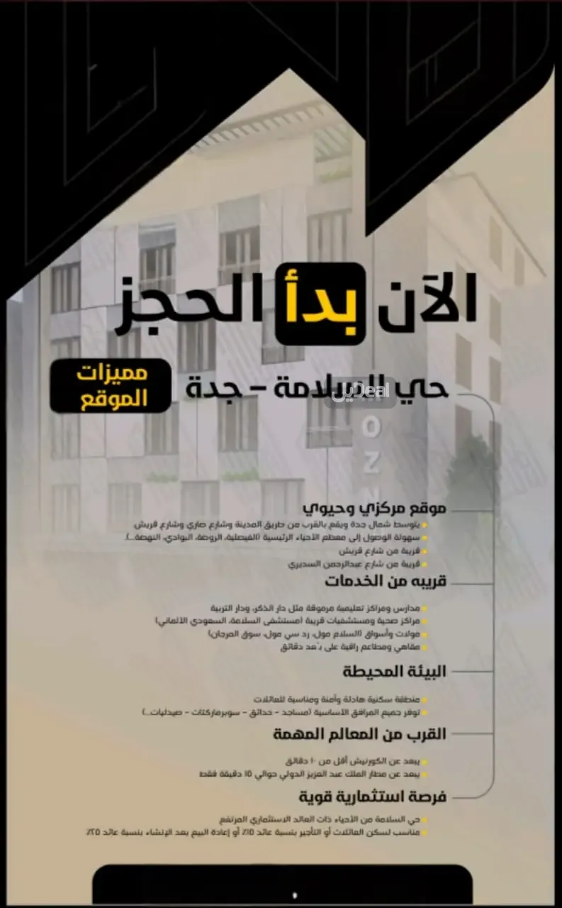 * موقع استراتيجي في حي السلامة * تصميم حديث وتشطيب فاخر * قرب المدارس والمولات والخدمات * السعر أقل من سعر السوق (فرصة للاستثمار والشراء) * ارتفاع قيمة العقار بعد اكتمال المشروع