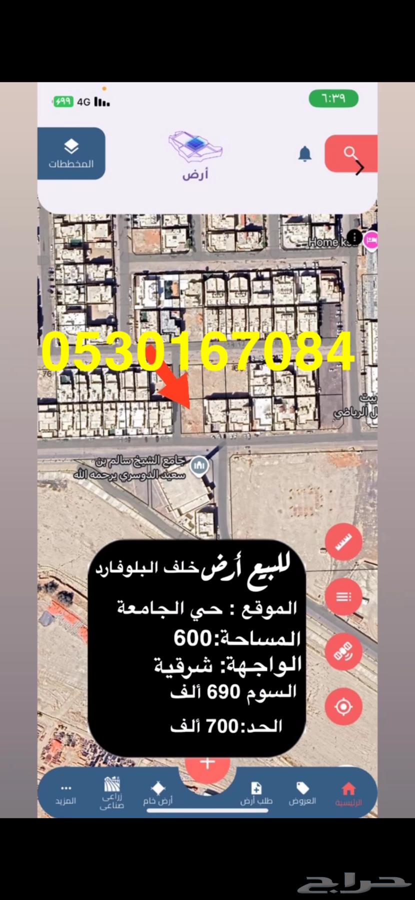 للبيع ارض سكنية الموقع في حي الجامعة بالخرج (( الموقع (( مميز جداً )) خلف ( البو ليفارد ) مقابل جامع الشيخ سالم سعيد الدوسري . 🔴 رقم المخطط 1546 ✅ قطعة رقم 63 🔷 مساحة 600 م 🔷 شرقية شارع 20 م / جنوبية ممر 8 م 🔸 سعر المتر ( 1150 )🔸 🔻السوم 69,0000 ألف البيع قريب 📞 للتواصل والاستفسار: سلطان عبدالله : ( رقم الجوال يظهر عند الضغط على زر تواصل ) ترخيص الإعلان / 7100235228 المساحة 600 متر عرض الشارع 20 متر الواجهة شارع رقم القطعة 63 رقم المخطط 1546 ----- نأمل مطابقة الموقع على الخريطة مع الموقع حسب الصك الضمانات و مدتها: لايوجد