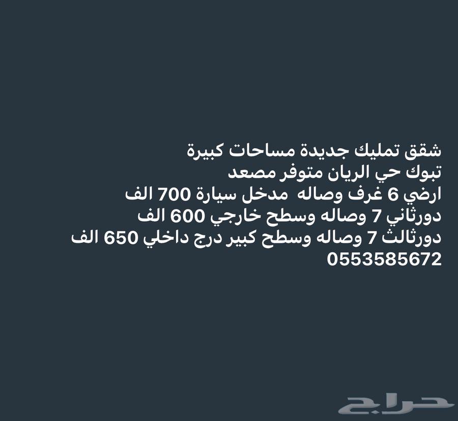 شقق تمليك مساحات كبيرة تبوك الريان الشقه الارضيه مساحتها 244 6 غرف وصاله ومطبخ ومستودع وغرفه خادمة ومدخل سيارة الدور الثاني 7 غرف وصالتين وغرفه خادمة متوفر مصعد الدورالثالث 7 غرف وصاله ومطبخ ومستودع وغرفة خادمة مع سطح كبير ودرج من داخل الشقه متوفر مصعد التواصل جوال ----- نأمل مطابقة الموقع على الخريطة مع الموقع حسب الصك الضمانات و مدتها: لايوجد