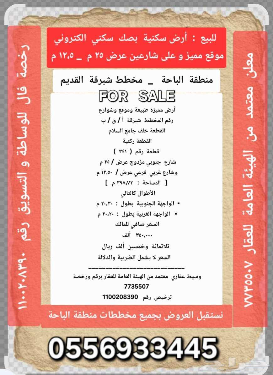 نستقبل العروض العقارية بجميع مخططات منطقة الباحة خبرة عقارية طويلة تضعها بين يديك فقط تواصل معنا وابشر بسعدك ________ للبيع أرض سكنية بصك سكني الكتروني منطقة الباحة مخطط شبرقة القديم مخطط رقم : أ / ق / ب خلف جامع السلام جميع الخدمات مكتمله بالمخطط قطعة سكنية رقم : 341 مساحة الأرض : 398.72 م الأرض على شارعين واجهتين واجهة جنوبية شارع عرض : 25 م واجهة غربية شارع عرض : 12،5 م السعر صافي للمالك / 350,000 ثلاثمائة و خمسين الف ريال السعر لا يشمل الضريبة والدلالة السعر لا يشمل الضريبة والدلالة ____________ عقد وساطة رقم : 6100268333 ترخيص اعلان رقم : 7100236820 رخصة فال للَوساطة : 1100208390 ____________ لتسويق عقارك بجميع مخططات منطقة الباحة تواصل معنا على الرقم التالي / ( رقم الجوال يظهر عند الضغط على زر تواصل ) ----- نأمل مطابقة الموقع على الخريطة مع الموقع حسب الصك الضمانات و مدتها: لايوجد