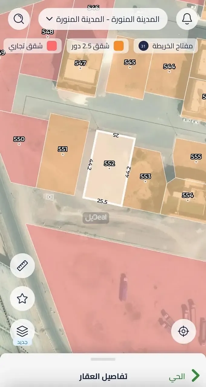 للبيع أرض سكنية مميزة المدينة المنورة حي حمراء الاسد /أ مخطط رقم 13/ف/1410 على ثلاث واجهات رقمها 552 ومساحتها 1099 م تحت السوم