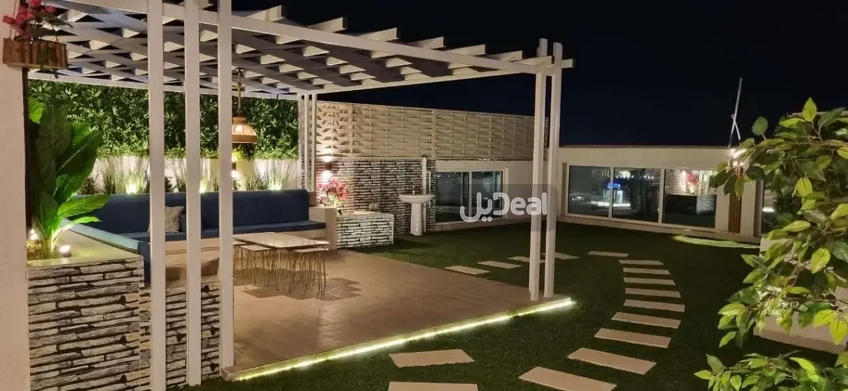 جلسة خارجيه بتصميم يوناني مطل ايضا عبر الزجاج ويتسع 10 اشخاص وبه وجار لشبة النار ومنقل للشوي ومزود محاط بالاشجار والاضاءاة الهادئة