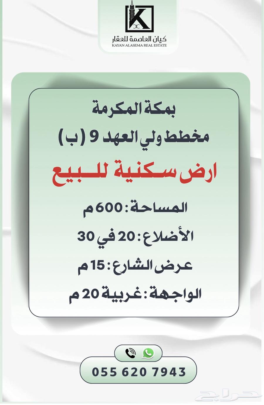 بمكة المكرمة - ولي العهد 9 ( ب ) ارض سكنية للبيع المساحة : 600 م الأضلاع : 20 في 30 عرض الشارع : 15 م الواجهة : غربية 20 م العرض للمشتري فقط للتواصل : ( رقم الجوال يظهر عند الضغط على زر تواصل )