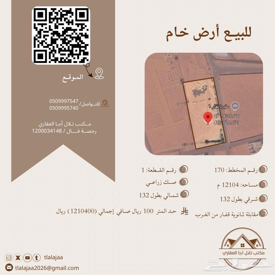 للبيع ارض زراعية للبيع ارض زراعية بقفار تفتح على ثانوية قفار من الغرب • رقم المخطط: 170 رقم القطعة: 1 مساحه: 12104 م صك زراعي شرقي بطول 132 شمالي بطول 132 حد المتر 100 ريال صافي إجمالي (1210400) ريال *مكتب تلال أجا العقاري*ا لتواصل ( رقم الجوال يظهر عند الضغط على زر تواصل ) / ( رقم الجوال يظهر عند الضغط على زر تواصل ) رخصة فال / 1200034148 رخصة فال إدارة أملاك / 2200004389 رخصة فال المزادات / 4200000992 ----- نأمل مطابقة الموقع على الخريطة مع الموقع حسب الصك الضمانات و مدتها: لايوجد