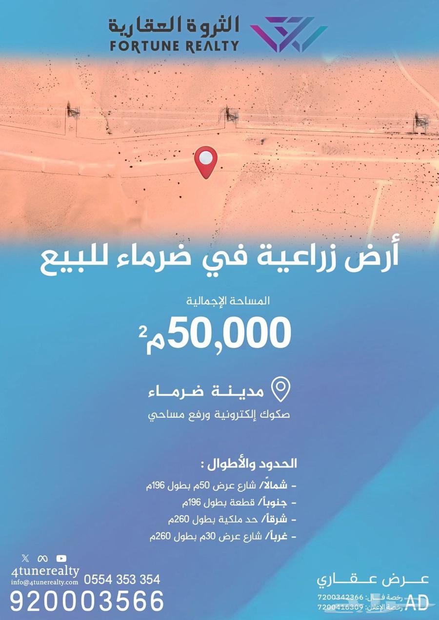 أرض زراعية مميزة زاوية في ضرماء ب *مساحة 50.000* م
