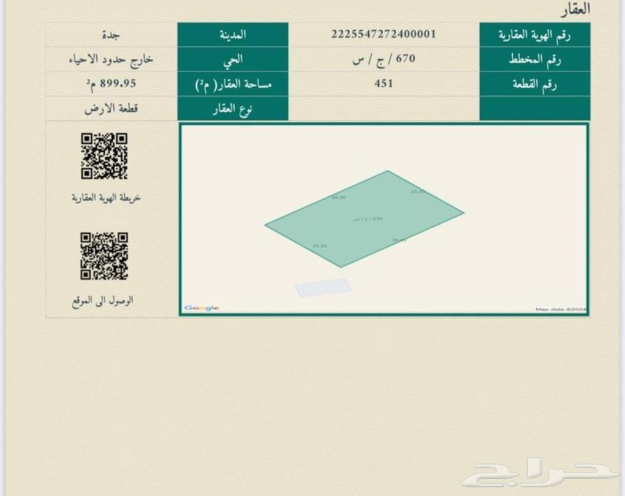 معلومات العقار حسب الرخصة مساحة العقار : 899.95 عرض الشارع : 25 رقم المخطط : 670 ج س واجهة العقار : شمالية خدمات العقار : لايوجد خدمات حدود وأطوال العقار السعر : 400027.78
