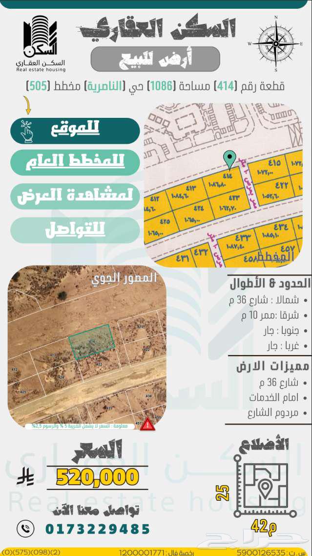 قطعة رقم 414 المساحة: 1086 م² الموقع مميز: • شارع شمالي 36م • شرقي: ممر 10م • واجهة على الخدمات • الشارع مردوم السعر: 520,000 ريال (السعر لا يشمل الضريبة 5٪ والرسوم 2.5٪) للتواصل المباشر: 📞 0173229485 مكتب السكن العقاري ----- نأمل مطابقة الموقع على الخريطة مع الموقع حسب الصك الضمانات و مدتها: لايوجد
