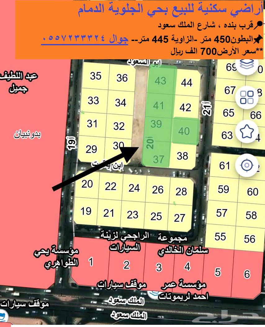 أراضي سكنية للبيع بحي الجلوية الدمام 📍قرب بنده ، شارع الملك سعود 📌أراضي مستوية وتربة ممتازة 📌مساحة الأراضي البطون450 متر 📌مساحة الاراضي الزاوية 445 متر 📌تصريح بناء سكني 3 أدوار ونص سعر الأرض :750 الف ريال جوال ( رقم الجوال يظهر عند الضغط على زر تواصل )