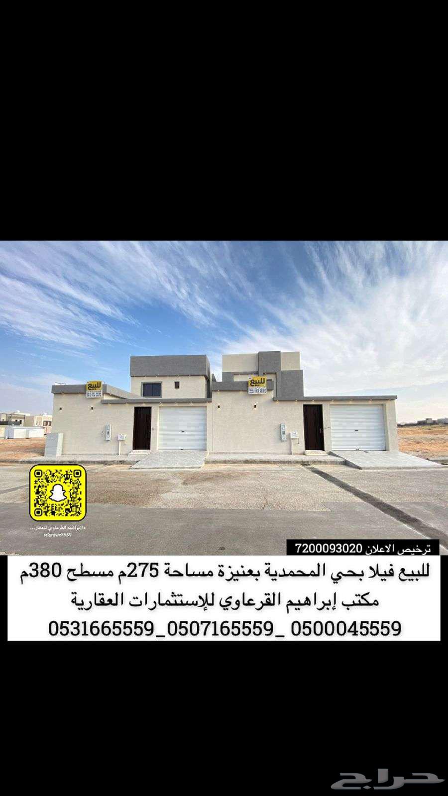 للبيع فيلا بحي المحمدية بعنيزة رقم العقار : 1952 مساحة الأرض : 275م